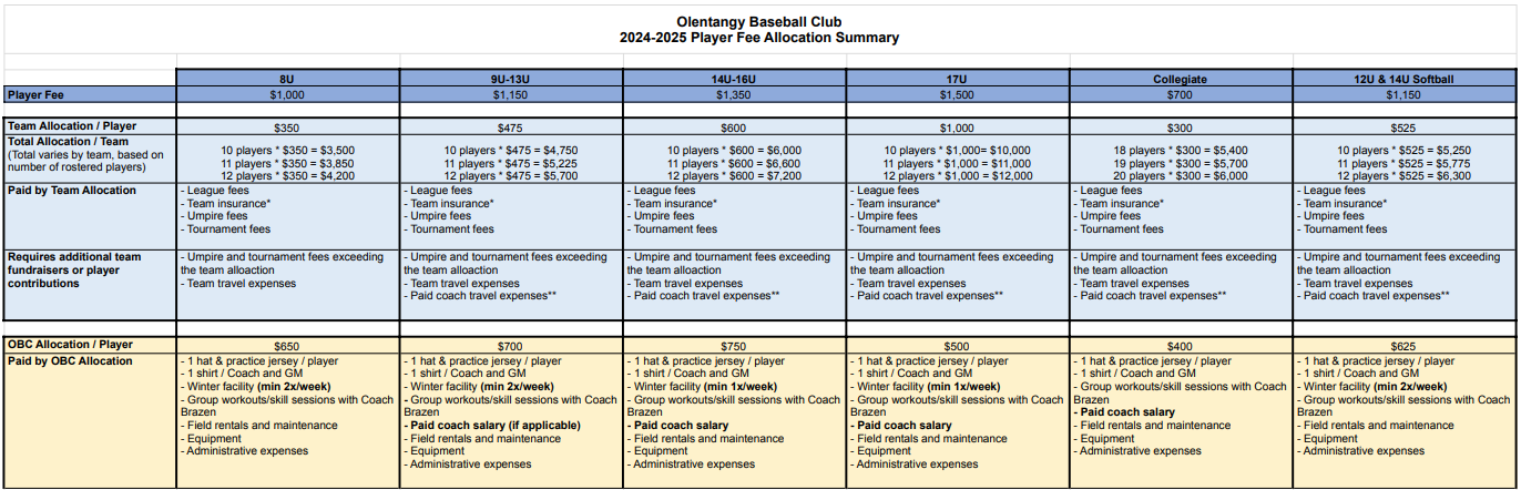 - Player deposits are due upon acceptance of team offer or rostering to the team (including coaches' players).