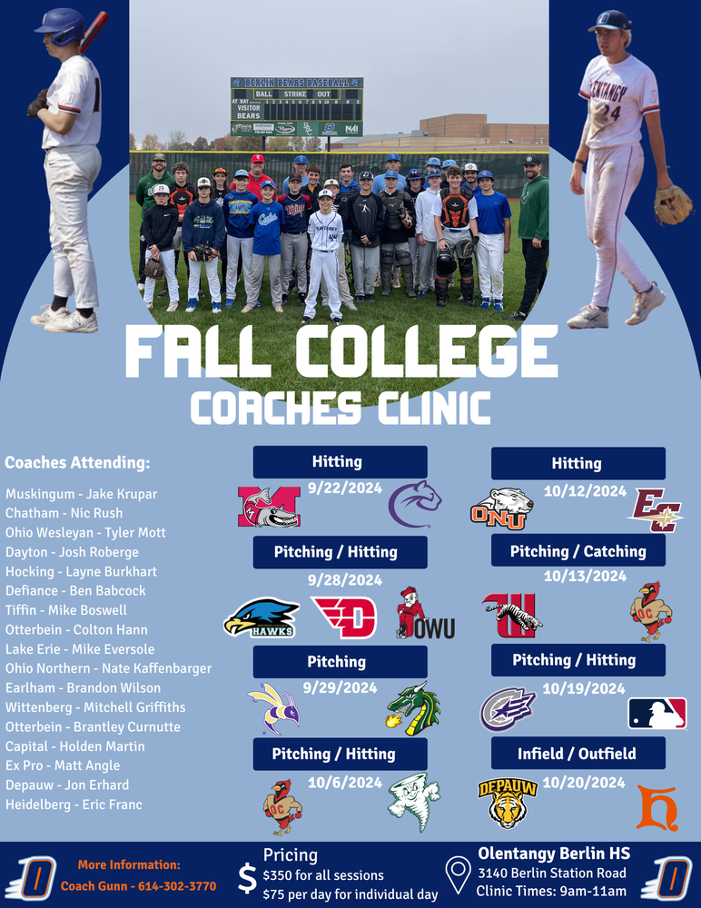 Olentangy Baseball Club is hosting the Third Annual Fall College Coaches Clinic. Ages 9-18 from all organizations are welcome! We will have 15 total college coaches left to attend over 7 more sessions. Each session will be 2 hours (9am-11am) and kids will get 1 hour with each coach. This is a great opportunity to get instruction from some of the most qualified and knowledgeable coaches in the area!
